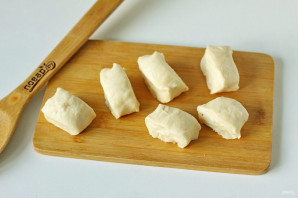 От теста отрежьте кусок и скатайте его колбаской. Нарежьте колбасу кусочками, размер зависит от желаемого размера мантов.