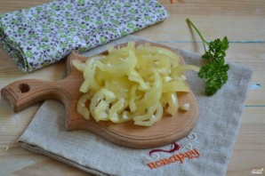 Болгарский перец разрежьте пополам, удалите семена и плодоножки, нарежьте тоненькой соломкой.