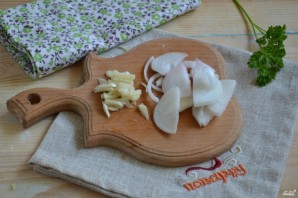 Чеснок нарежьте тоненькой соломкой. Лук – полукольцами.