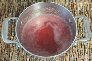 Когда желатин полностью растворился, выливаем в кастрюлю клубничное пюре, перемешиваем и убираем с огня. Получается 500 мл. ягодного пюре с водой и желатином.