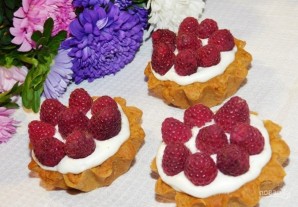 Украсьте корзиночки кремом и ягодами свежей малины. Дайте им немного постоять в холодильнике.