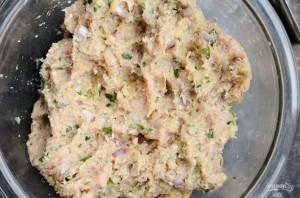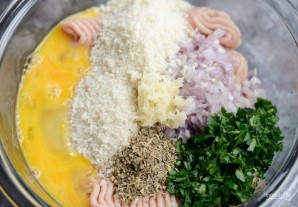 1. Сделайте фарш. Мелко нарубите петрушку, смешайте её с натёртым пармезаном, травами, фаршем, яйцами и измельчённым чесноком с луком.