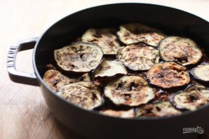 9. Выложите на дно формы для запекания 1/3 баклажанов, сверху распределите половину мясного соуса.