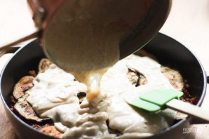 11. Уложите поверх оставшиеся баклажаны и вылейте второй соус (мука+молоко), распределите его по всей поверхности.