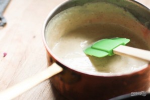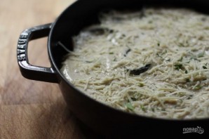 7. Сделайте другой соус: растопите в отдельной сковороде сливочное масло, добавьте к нему муку и размешайте венчиком, влейте стакан молока и перемешайте, затем влейте оставшееся молоко. Доведите смесь до кипения, варите 2-3 минуты и снимите с огня. Добавьте тертый сыр (2 столовые ложки), мускатный орех, соль, перец.
