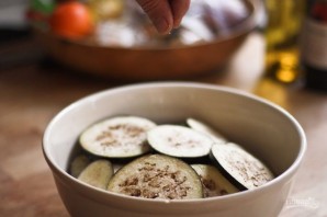 2. Выложите кружочки баклажана в миску и посыпьте солью, это поможет избавиться от горечи.
