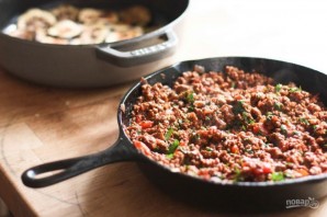 10. Накройте мясной соус второй частью баклажанов, выложите оставшийся мясной соус.