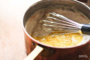 8. В другой миске взбейте куриное яйцо, введите его к остывшему соусу на основе молока и муки, перемешайте.