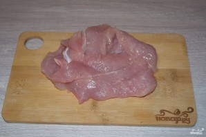 Куриное филе нарезаем на пластины. Каждую пласнину отбиваем молоточком для мяса. Бейте не очень сильно, чтобы мясо не порвалось. Посолите и поперчите.