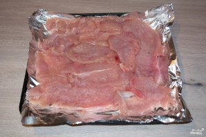 На противень стелим листик фольги. Смазываем его растительным маслом. На фольгу выкладываем отбитое куриное филе.