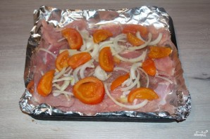 Репчатый лук нужно нарезать полукольцами. Замариновать в 2 ст. ложках 6% уксуса, добавив 1 ст. ложку сахара. Оставить мариноваться на 20 минут. Лук промыть под проточной водой. Выложить на мясо. Нарезать помидоры. Выложить их сверху.