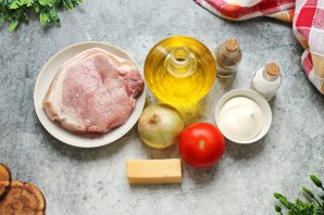 Подготовьте все необходимые ингредиенты для приготовления мяса по-французски с помидорами и сыром. Репчатый лук почистите и вместе с помидорами вымойте и обсушите.