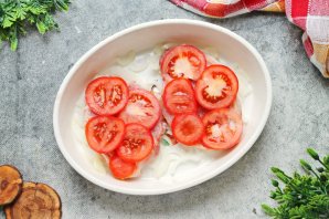 Выложите мясо поверх репчатого лука. Помидоры порежьте колечками и выложите на мясо внахлест ровным слоем.