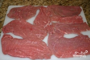 2. Из одного кусочка мяса необходимо сделать 4-6 тоненьких ломтика. Делать это лучше острым ножом. Если мясо немного подморозить, то резать его будет значительно проще.