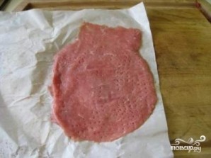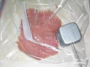 3. Каждый ломтик необходимо завернуть в полиэтиленовый пакет или пищевую пленку и тщательно отбить. Мясо должно быть тонким, но без надрывов и дырочек.