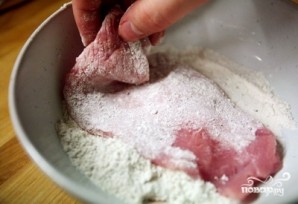 5. Немного посолить и поперчить по вкусу. На каждый кусочек мяса нужно положить по 1 тонкому ломтику сыра. Мясо можно завернуть или наверх положить еще один кусочек мяса. Края немного отбить молоточком, чтобы они не расходились. Обвалять каждый кусочек мяса в муке.