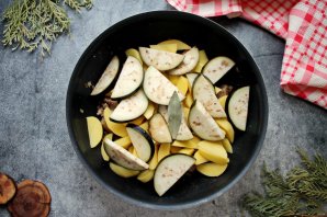 Картофель нарежьте вдоль средними дольками и добавьте в казан.