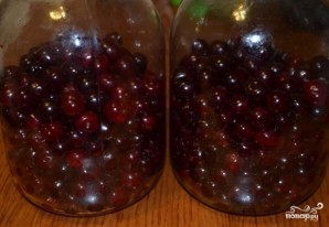 1. Вишню очищаем от веточек, хвостиков и листьев, хорошо промываем ее и откидываем на дуршлаг, чтобы ушла лишняя жидкость. Распределяем вишню по двум 3-х литровым банкам.