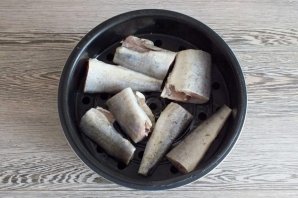 По истечении времени выложите рыбу в чашу для пароварки. Вставьте ее в мультиварку. Закройте крышку и варите в режиме "Пароварка" 20 минут.