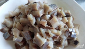 Филе слабосолёной сельди проверьте на наличие косточек, удалите их, если обнаружите. Порежьте рыбу на небольшие кусочки. Я использую сельдь как бюджетный вариант. Можно заменить её лососем или другой рыбой.
