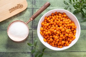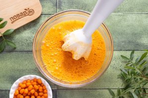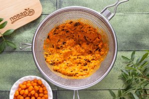 Добавьте такое же количество сахара, сколько вышло облепихового сока, все перемешайте.