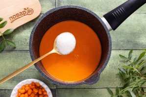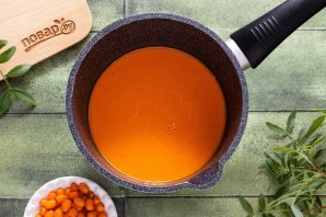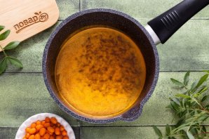 Перелейте получившийся облепиховый сок в кастрюлю с толстым дном.