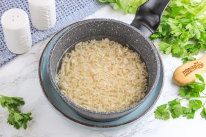 Вермишель отварите в воде в течение 10-12 минут и слейте весь бульон. Выложите вермишель в миску и слегка остудите, чтобы яйцо не свернулось при добавлении. Если вермишель уже отварена, то работайте с ней сразу.