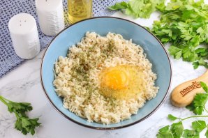 Вбейте куриное яйцо, всыпьте приправу, соль и тщательно перемешайте.