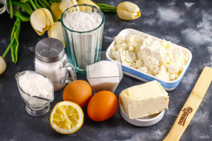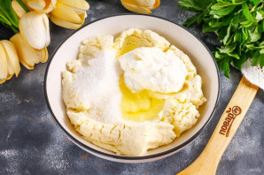 Творог и сметану любой жирности выложите в глубокую емкость. Туда же всыпьте оставшийся сахар, цедру лимона и вбейте куриный белок. Желток можно не добавлять. Измельчите все погружным блендером, чтобы исключить комочки творога.