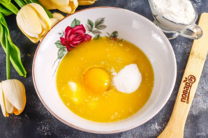 Сливочное масло растопите в глубокой емкости на водяной бане или в микроволновке, но не до кипения. Вбейте в него куриное яйцо, всыпьте 2 ст.л. сахара и соль. Взбейте все венчиком или вилкой.