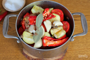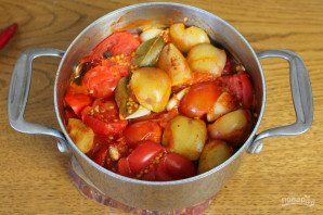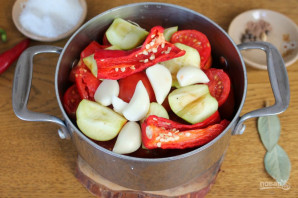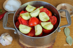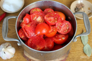 Помидоры нарезаем крупно и кладем в кастрюлю.