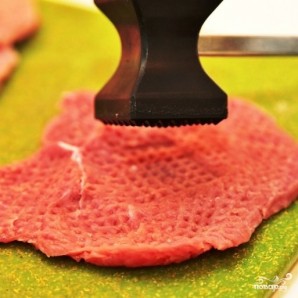 Хорошенько отбиваем эскалопы - так, чтобы они стали примерно вдвое тоньше.