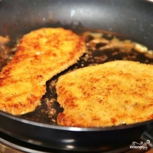 Панированные отбивные обжариваем на сковороде до образования легкой корочки с обеих сторон.