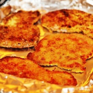 Обжаренные отбивные перекладываем на противень, застланный фольгой.