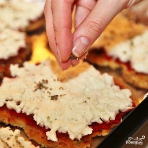 Моцареллу (при желании, можно натереть сыр другого сорта) крупно натираем, присыпаем ей каждую отбивную.