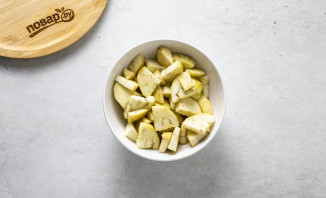 Баклажаны очистите от кожуры, нарежьте ломтиками среднего размера. Немного подсолите, перемешайте и отложите в сторону.