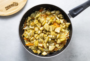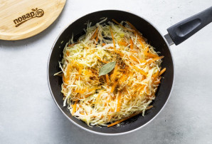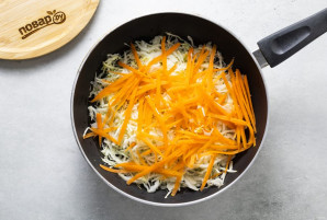 Тонко нашинкуйте капусту и натрите морковь на терке. Разогрейте сковороду с растительным маслом и обжарьте овощи пару минут.
