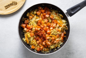 Добавьте нарезанные кубиками помидоры и томатную пасту. Влейте воду и тушите овощи 10-12 минут без крышки.