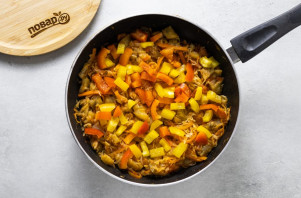 Добавьте нарезанный кубиками сладкий перец. Посолите и тушите овощи еще 5-6 минут.