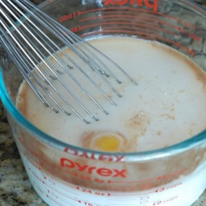 В отдельной мисочке перемешиваем сливочное масло, молоко, яйцо и ванильную эссенцию.