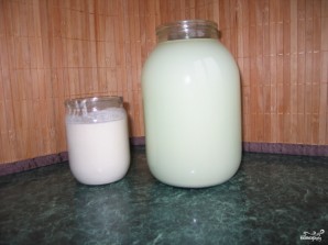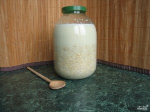 В банке, емкостью 3 литра, смешиваем все ингредиенты. Вода должна быть комнатной температуры, кефир тоже. Если у вас есть цельные зерна овса - можно добавить одну-две столовых ложки. Закрываем банку и ставим в теплое место для брожения на сутки-полтора. Обязательно ставим банку в темное место или укутываем чем-либо, чтобы свет не попадал на банку.