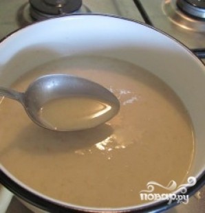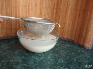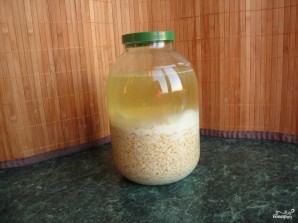 Если вы делаете кисель в теплое время года, то для брожения смеси обычно хватает суток. Зимой этот процесс может затянутся до двух суток. Но не более! После того, как брожение закончилось, нам необходимо профильтровать смесь. Готовим большую емкость, в которую будем процеживать жидкость, вооружаемся дуршлагом и приступаем.