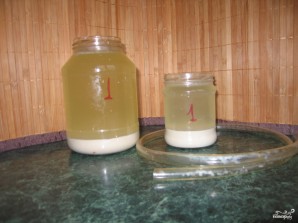 Аккуратно, чтобы не взболтать, сливаем жидкость из банки. Можно воспользоваться трубочкой. В результате мы получили овсяный квас и концентрат для приготовления киселя. Хранить их можно в холодильнике не больше трех недель