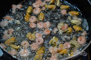Креветки и мидии сначала обжарьте в оливковом масле, а затем уберите из сковороды.