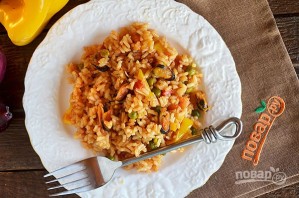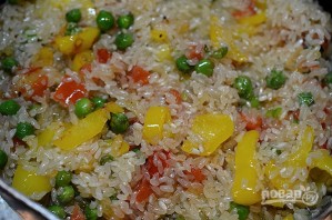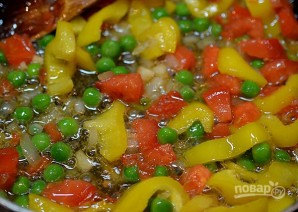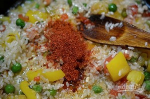 Добавьте рис (рис лучше не промывать, получится вкуснее). Обжаривайте всё около 5 минут.