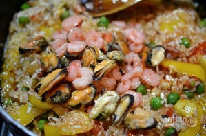 Рецепт не отнимет много времени. Это традиционное испанское блюдо приготовить не составит труда даже начинающей хозяйке. Морепродукты и овощи по отдельности обжариваются в оливковом масле, а затем в масле обжаривается рис, всё заливается рыбным бульоном и доводится до готовности риса. Достаточно просто, не правда ли? Зато это блюдо по достоинству оценит ваша семья, ведь оно не только вкусное, но и очень яркое, красивое Подавайте горячим.