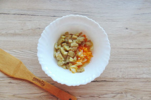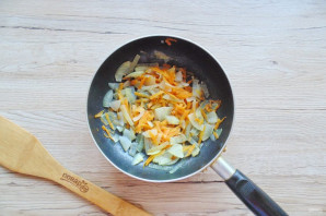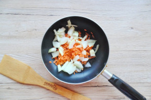 Лук и морковь очистите, помойте. Лук нарежьте полукольцами, а морковь натрите на тёрке. Выложите в сковороду.