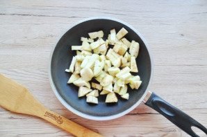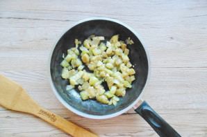 Баклажан очистите, помойте, нарежьте кубиками и выложите в сковороду.