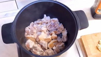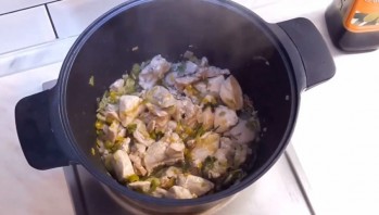 1. Отправьте курицу обжариваться на оливковом масле. Пока она обжаривается, залейте желатин водой и оставьте его набухать.