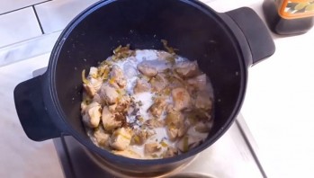 3. Добавьте розмарин. Когда овощи с курицей почти обжарятся, добавьте соль и белое вино. Дайте вину выпариться, добавьте мускатный орех и добавьте еще соли. Залейте курицу сливками и тушите еще 2 минуты.